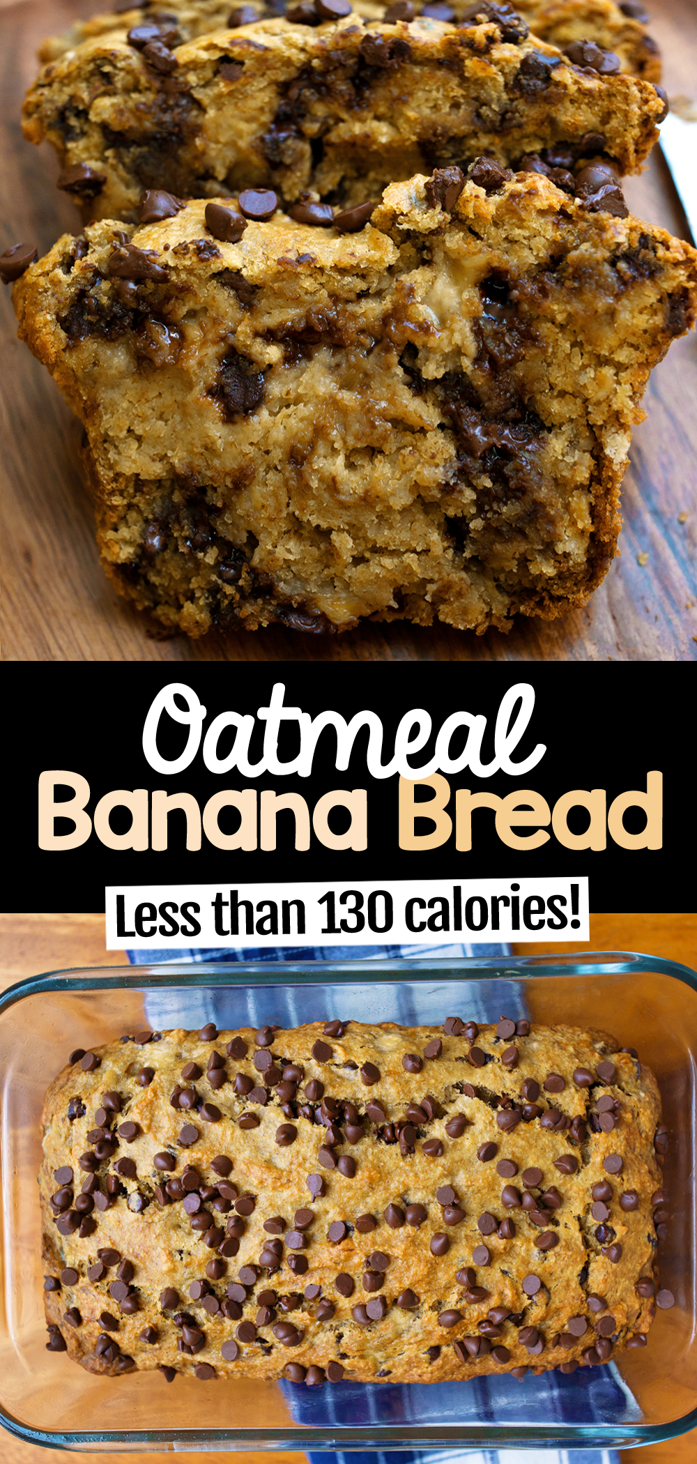 - Pré -aqueça o forno a 350 F. Unte uma panela de pão de 9 × 5 polegadas ou alinhe o fundo com papel manteiga. Mexa todos os ingredientes de pão de banana de aveia em uma tigela grande até se combinarem uniformemente e depois alise a panela preparada. Polvilhe lascas de chocolate por cima, se desejar. Asse por 35 minutos ou até que um palito inserido no centro saia principalmente limpo. Deixe esfriar, depois vá em volta das laterais com uma faca e transfira para uma placa de servir. Fatia e aproveite. Lefrigerar as sobras em um recipiente coberto por até cinco dias ou congelar por até três meses.Ver fatos nutricionais